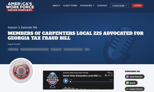Daniel Hicks, Business Representative for Local 225, recently appeared on America's Work Force Union Podcast to discuss the efforts of his fellow brothers and sisters from Local 225, as well as members of Augusta Local 283 and Savannah Local 256 of the Southeastern Carpenters in Georiga to push for the passage of a tax fraud bill aimed at reducing worker misclassification in Georgia. Check out the podcast: https://bit.ly/3AdfuZZ
